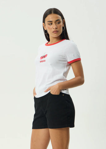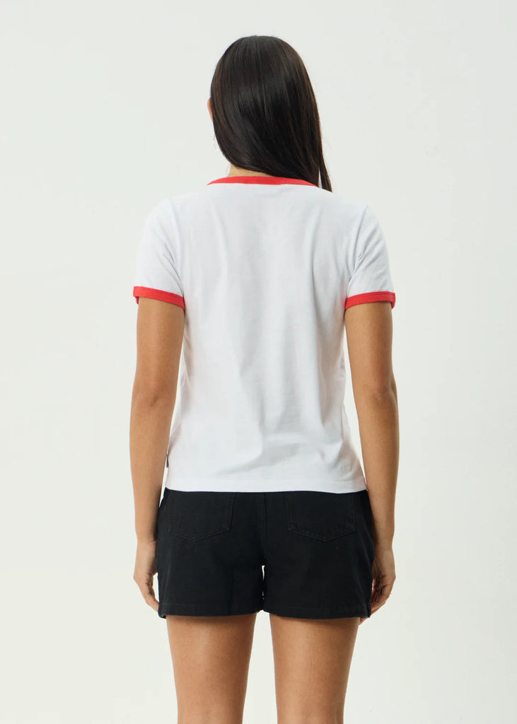 'Abiza' ringer tee in our regular fit. Contrast neck and sleeve binding and printed graphic adds a pop of colour to this design. Made from a recycled cotton blend jersey.
