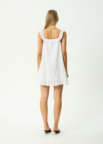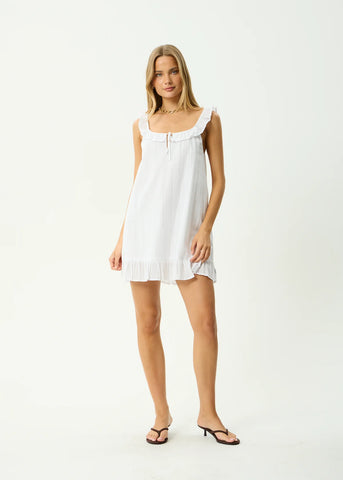 The Aquarius collection uses a lightweight, semi-sheer striped fabric made from 100% organic cotton. Breathable and airy, it offers a soft hand feel that’s comfortable to wear in warm weather while maintaining a delicate, floaty drape. This mini dress offers a relaxed babydoll silhouette, fully lined for coverage, with an elasticated neckline and sleeves, ruffle detailing, gathered hem, and a keyhole tie front.