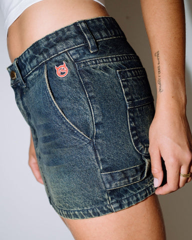 Mini Low Rise Denim Skirt With Carpenter Details And Logo Embroidery. 100% Cotton Indigo Denim