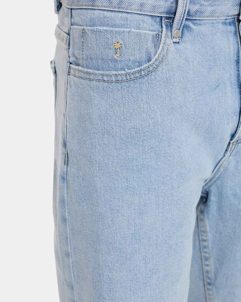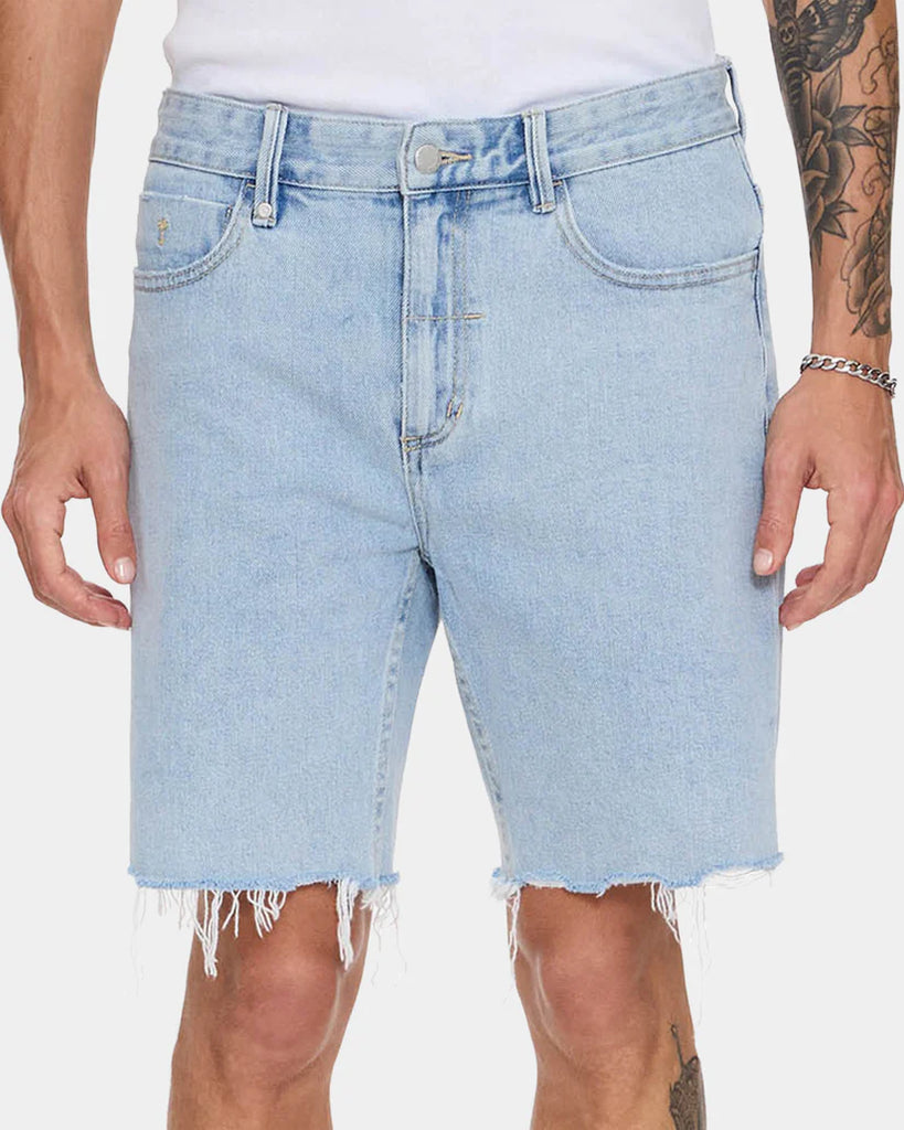 This Bones Denim Short in Ether Blue is cut out for an effortless summer style. With a relaxed mid-rise and slim-fitting legs, it's a go-to for a street-ready modern look with a touch of vintage. Made from cotton denim with just the right stretch and frayed hems that pair well with skate-ready oversized men's tees.