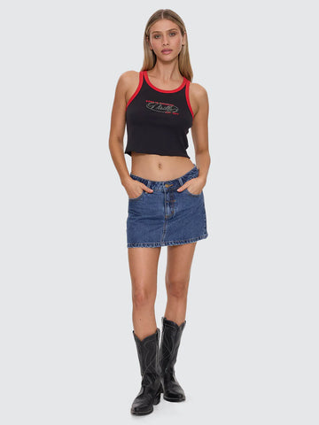 The Chaos Reigns Studded Tank in Washed Black nails a slim, cropped silhouette with a raw hem and contrast bind that throws a sharp frame around the shoulders. Cut from lightweight cotton rib, it's stretchy, sturdy, and comfy from first wear. A studded chest print brings the garage-merch attitude, while the washed black finish keeps it looking lived-in. Made to be a women's streetwear favourite, this tank top is easy to style with a micro skirt or baggy cargos for extra volume and attitude.