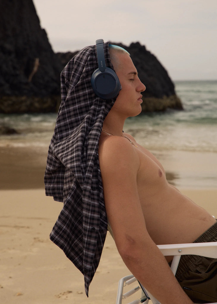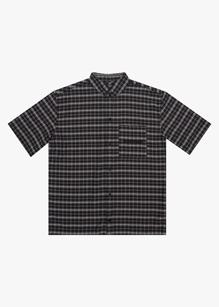 The ‘Darkness’ short sleeve shirt is made with a custom yarn dyed woven check in a lightweight fabrication that blends lyocell and recycled cotton for a comfortable, sustainable feel. Designed with a boxy fit, traditional collar, centre front button up, and left chest patch pocket with embroidered logo.