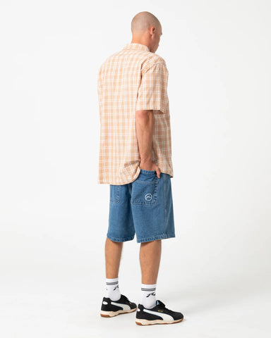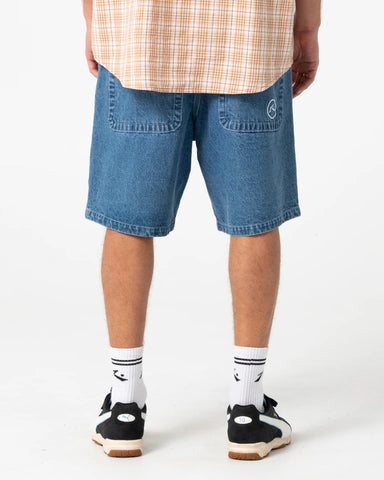 Baggy Fit Walkshort With A 22.5 Inch Outseam And Pocket Embroidery. 100% Cotton Indigo Denim