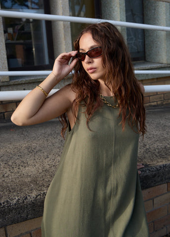 Halle introduces a new colour in our breathable, midweight linen blend fabric with a crepe texture. This mini dress is designed with an A-line relaxed fit, high neckline, scooped low back and side seam pockets to store your essentials.