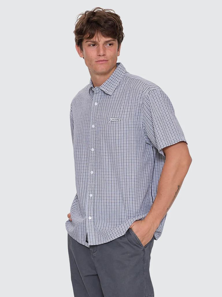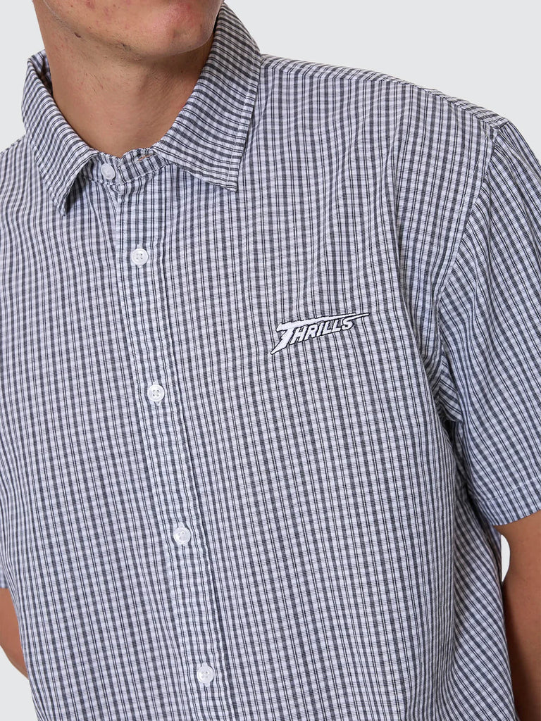 Clean lines with a jolt of attitude, the Heavy Voltage Cropped Short Sleeve Shirt in White keeps things sharp without losing the lived-in Thrills feel. Cut from crisp cotton with a yarn-dyed check, the cropped silhouette brings a modern edge to a classic button-up. Finished with a clean collar and subtle embroidery, this men's shirt is built for easy styling, whether worn loose, layered, or buttoned clean. Light, breathable, and made to move, this men's streetwear piece is an all-season hit.