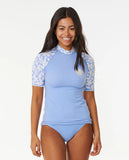 The Holiday Tropics UPF50+ Short Sleeve Rash Vest offers both style and sun protection. It features yardage print panels that add a fashionable touch. This rash vest provides UPF 50+ UV sun protection to keep you safe under the sun. The printed logo and inner neck print add stylish details. Enjoy your beach or pool days with confidence and comfort in this UPF50+ rash vest.