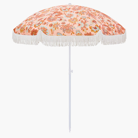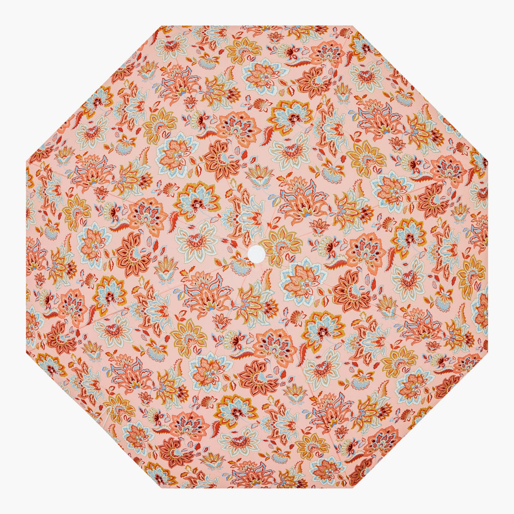 Our Bellflower beach umbrella is adorned in flowing bohemian florals against a soft peach backdrop. Crafted from UPF50+ premium fabric with a tilting canopy, it’s built for style and durability. Complete with a matching carry bag, Bellflower delivers effortless shade, comfort and an elevated look for long, sun-filled days by the water.