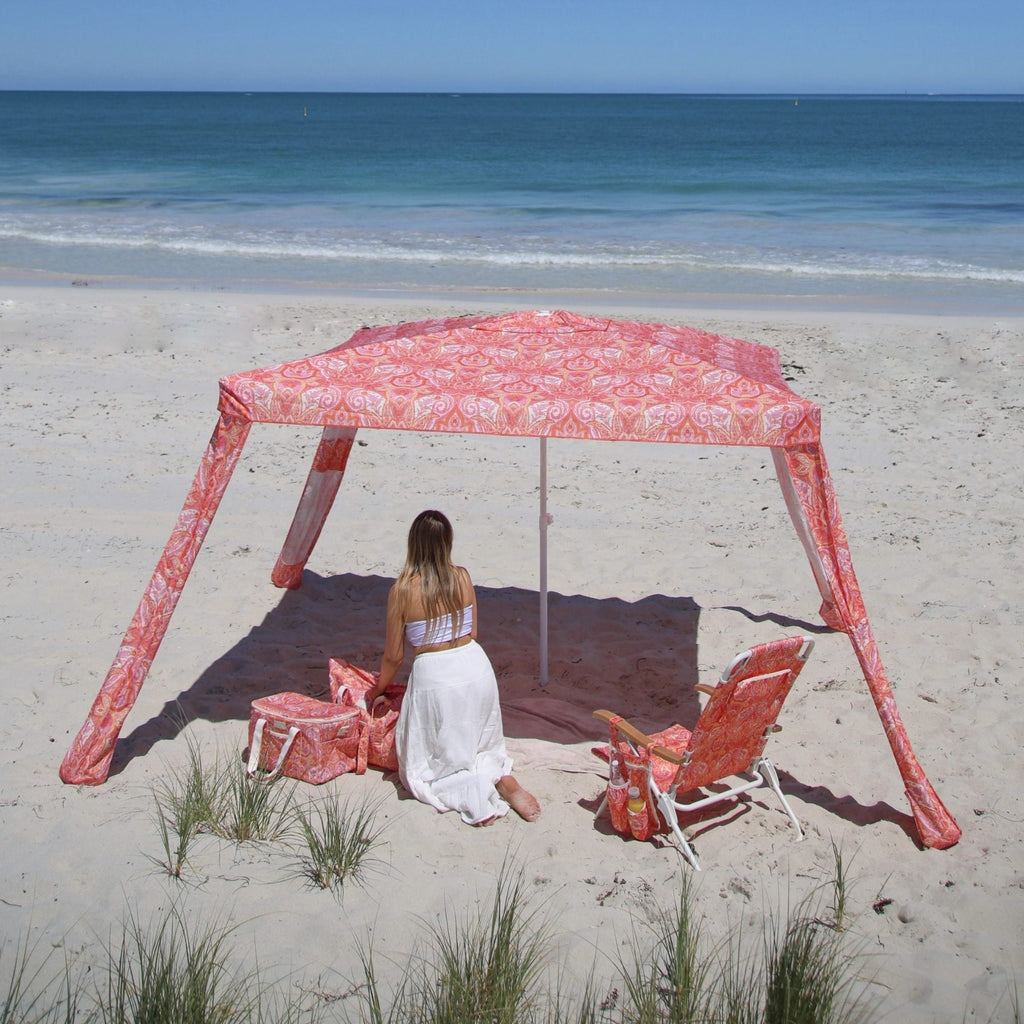 Our Paisley beach cabana is adorned with an intricately hand-painted bohemian print that’s as captivating as it is vibrant. Each detail captures the spirit of wanderlust, creating the perfect setting for cherished memories under the sun. Embrace the artistry, embrace the moment - this is summer, elevated.