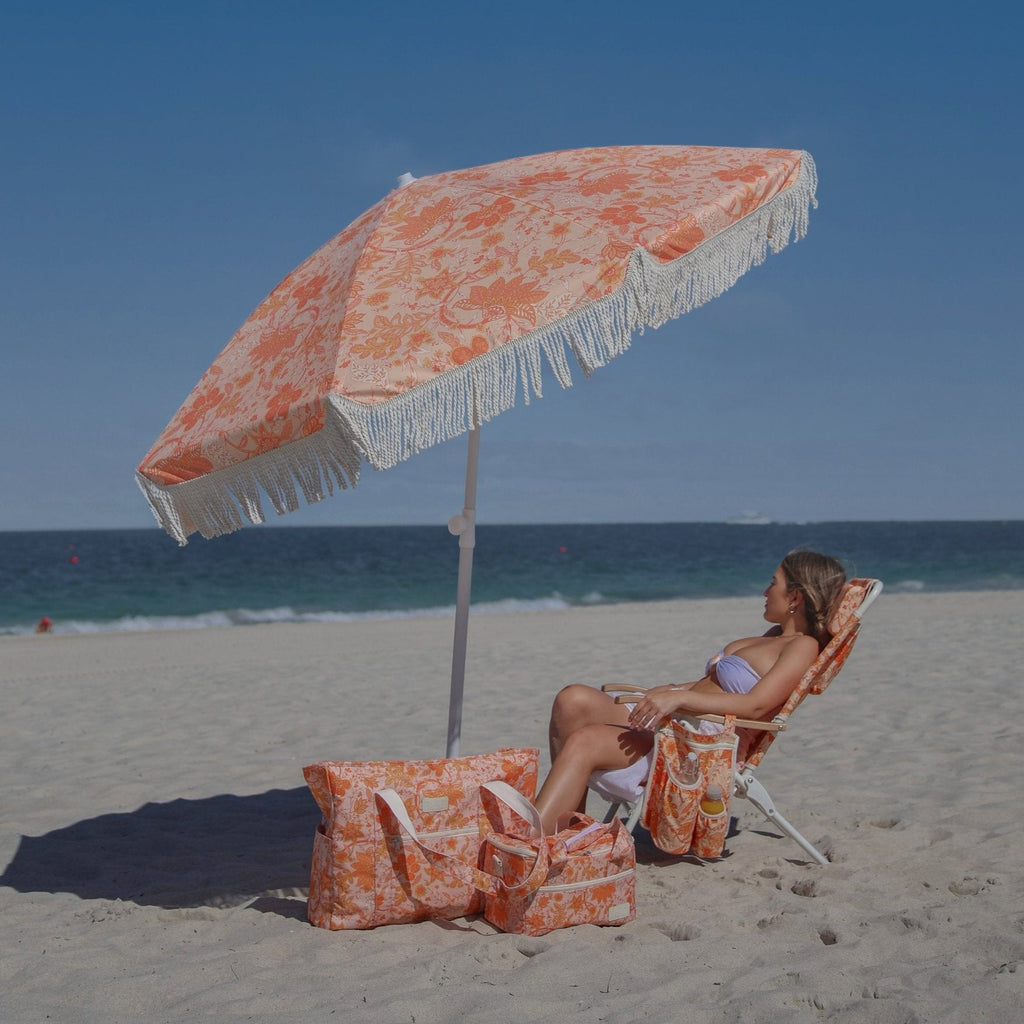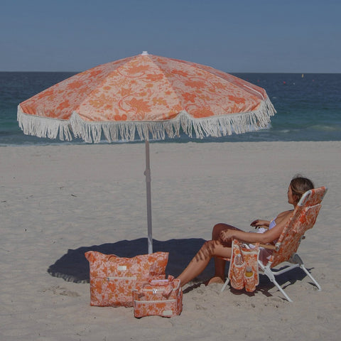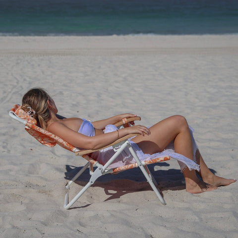 The Del Sol reclining beach chair combines vibrant shades of orange and yellow with a soft apricot backdrop, capturing the warmth of an endless summer. Built for comfort, it features multiple recline positions and a lightweight foldable frame and carry bag for easy transport and storage - premium design with everyday practicality for beach, park, and poolside.