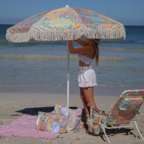 The Gardenia beach umbrella blends bohemian motifs with romantic florals in a lively patchwork of colour. Crafted with UPF50+ premium canopy fabric, a tilting mechanism and a matching carry bag, it’s designed for ease and longevity. Gardenia brings playful colour, comfort and practicality to long, sun-filled days by the water.