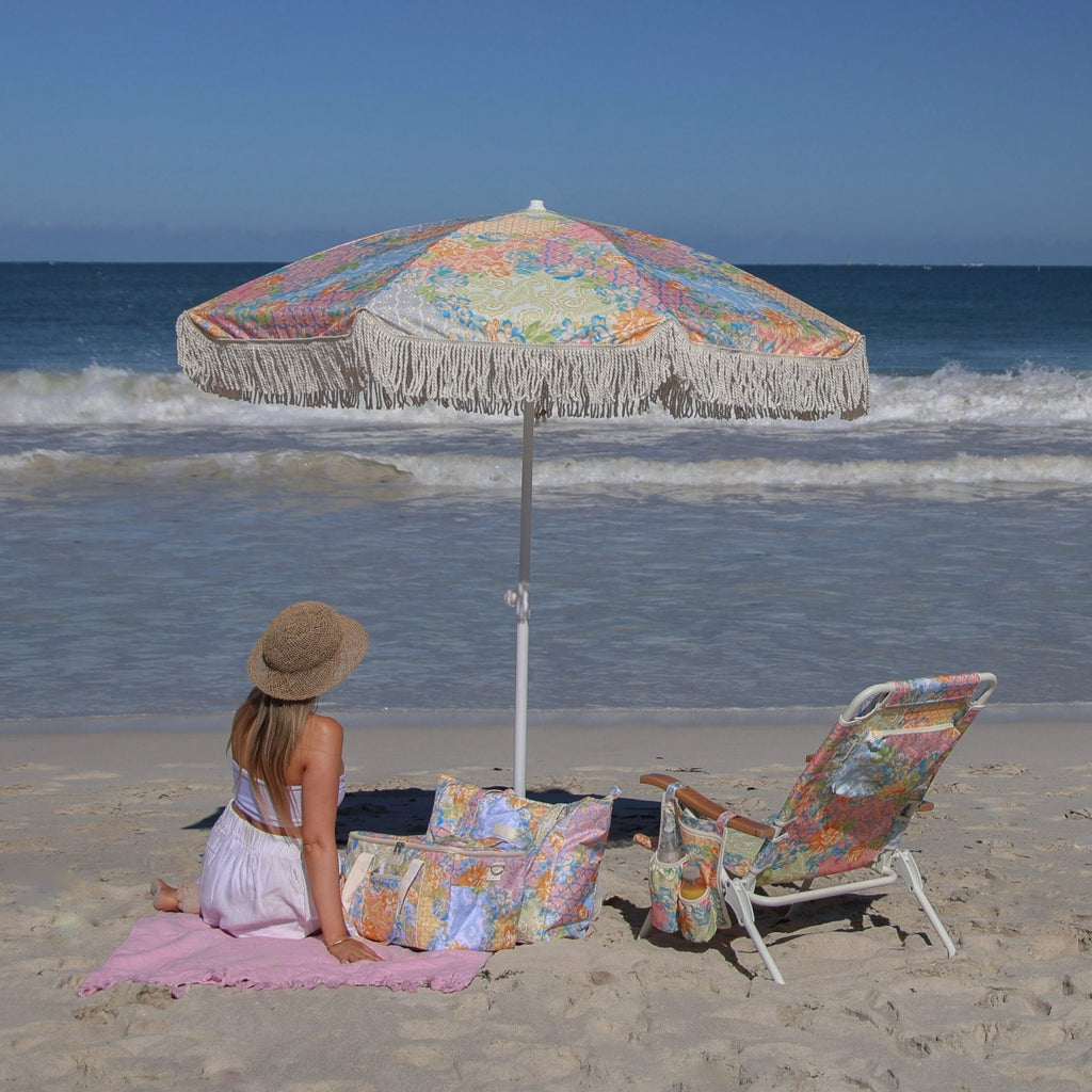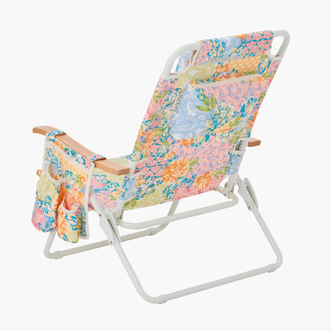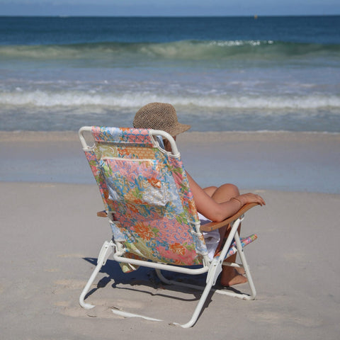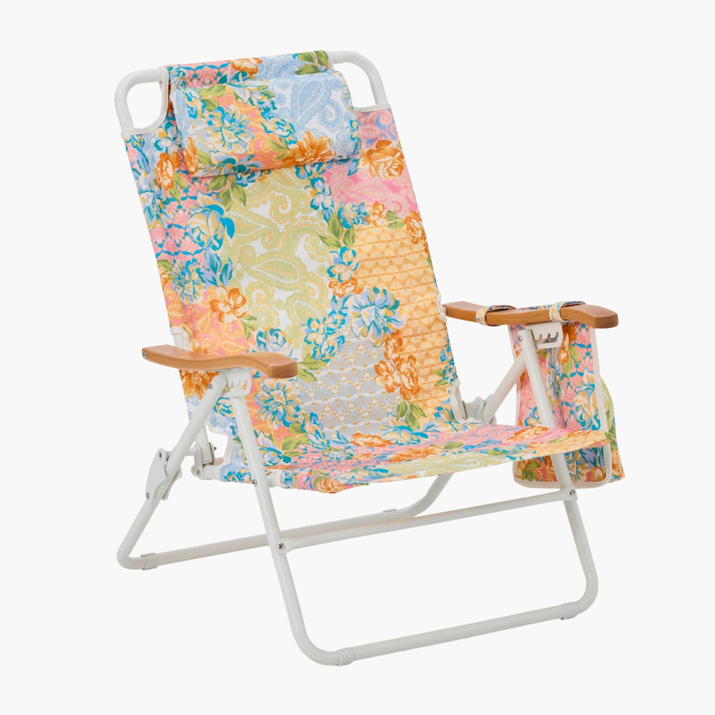 The Gardenia reclining beach chair is a lively patchwork of bohemian motifs and romantic florals. Built for comfort, it features adjustable recline and supportive seating. The lightweight, fold-flat frame moves easily from car to coast, delivering vibrant style with everyday comfort and practicality.