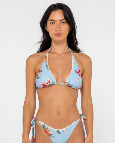 Halter Bikini Top With Contrast Blanket Stitch Detail And Custom Floral Print. Recycled Nylon + Extra Life