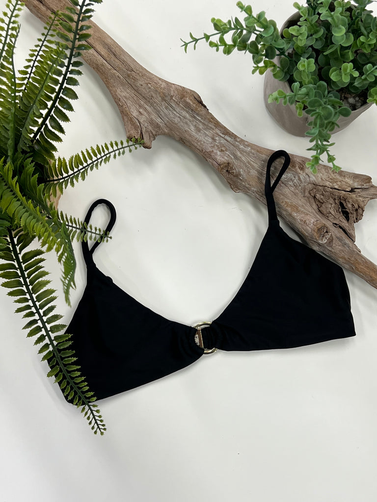 This halter bikini top is a sophisticated twist on the classic halter design, featuring an eye-catching detail of mini O-ring in the centre. It's simple yet flattering triangle fit is perfect for those who want a staple bikini for all occasions!