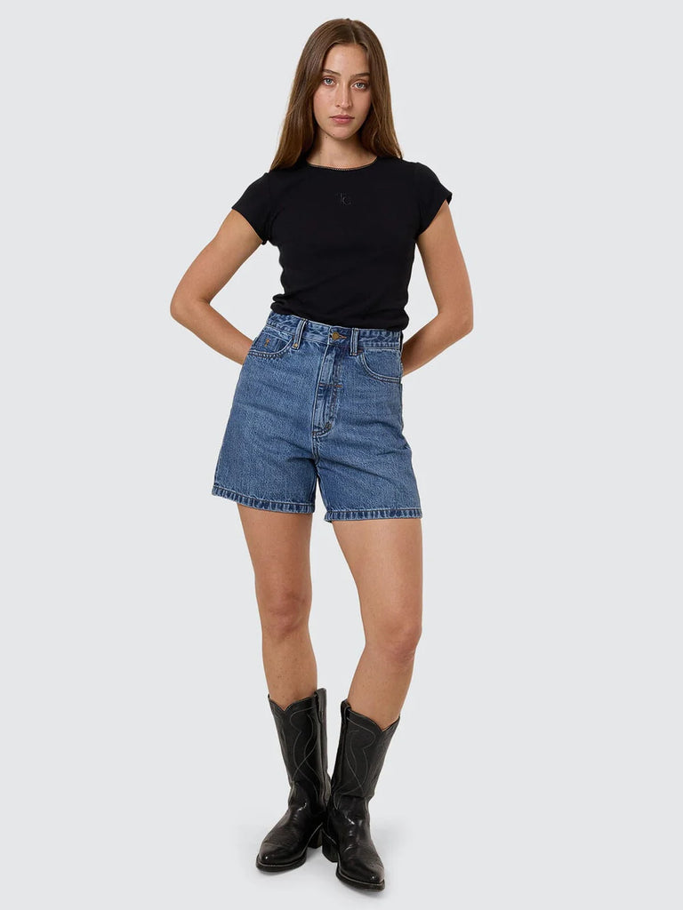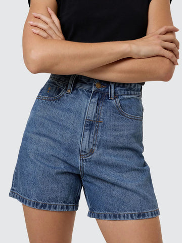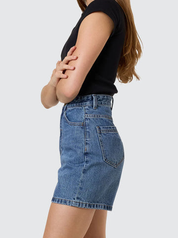 Cool, clean, and made to move, the Koko Short in Stoned Blues is a no-brainer for spring and long summer days. Crafted from a premium, midweight denim with a 60/40 cotton blend, these high-waisted shorts serve structure without sacrificing comfort. The wide hems and faded wash lean into true vintage denim shorts territory, while the 5-pocket design offers styling versatility. Whether paired with women's crop tops or women's oversized graphic tees, these casual cotton shorts are a street-ready hit.