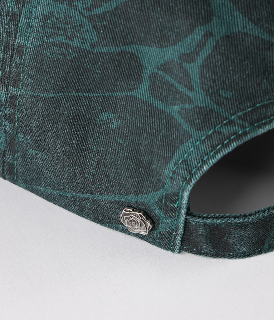 Crafted from 100% cotton twill and delivered in our flat peak 6 panel cap design with a vintage wash finish. Featuring front graphic embroidery, printed yardage, Signature FORMER Rose Rivet on Rear of Cap and metal clasp and O ring closure.