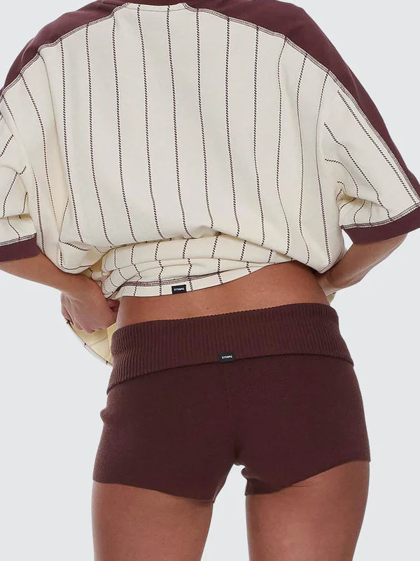 Ramp up the attitude in the Mackenzie Knit Booty Short in Bitter Chocolate, showing off a micro silhouette that exudes throwback energy with a roll fold-over waist. Crafted from a soft, stretchy knit, it hugs comfortably while keeping things lightweight, effortless to style, and easy to move in. Whether you're lounging, styling, or stepping out, these womens knit shorts pair perfectly with oversized tees, cropped knits, or layered street fits for a confident, fearless street fit.