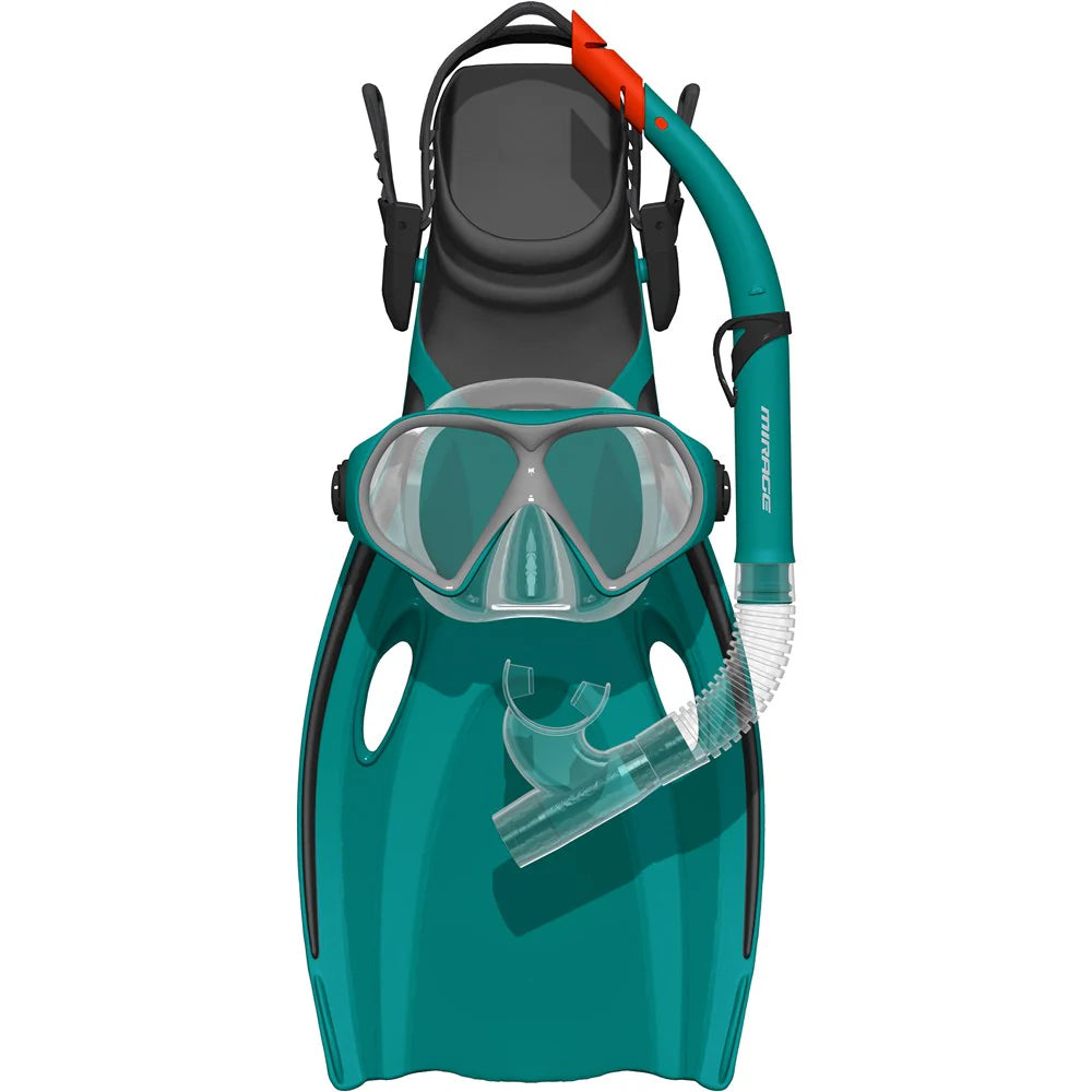 *The perfect "Holiday Makers" pack*Twin Tempered Glass lenses*Silitex Easy Fit Mask shape fits most faces*Splash guard and purge valve in fall away style snorkel*Open heel fin design for versatile sizing