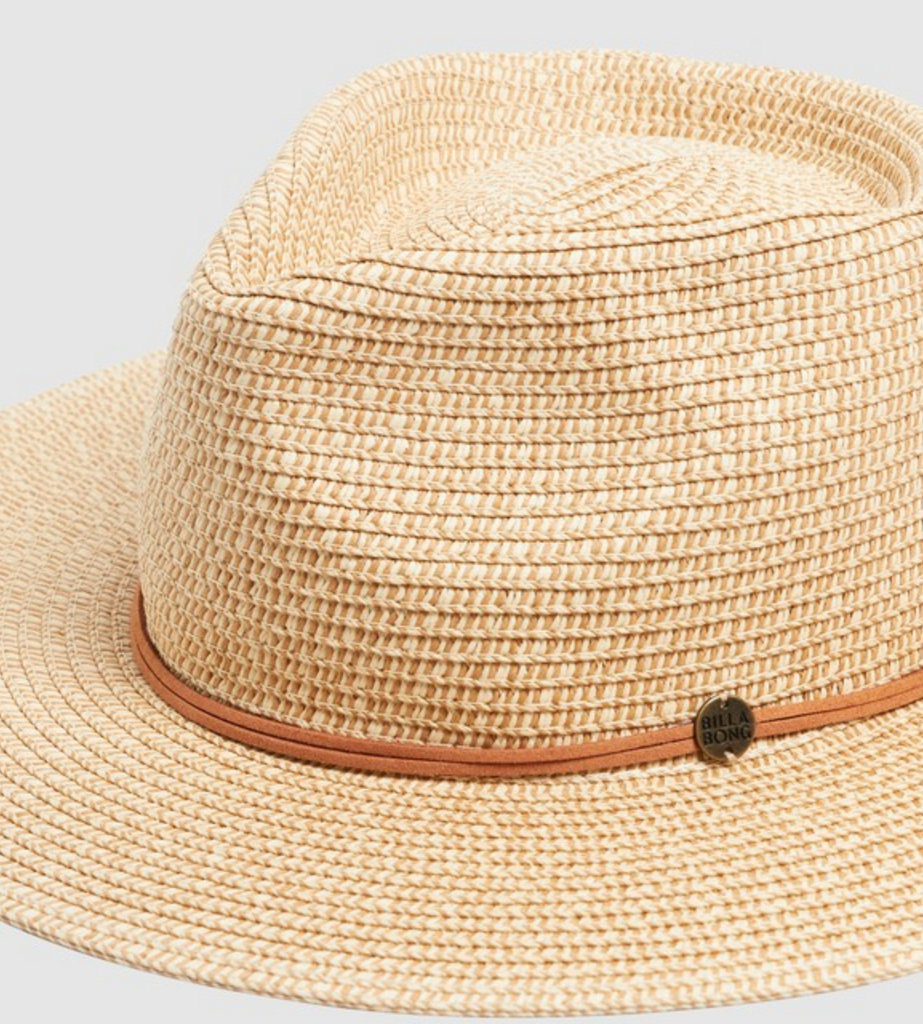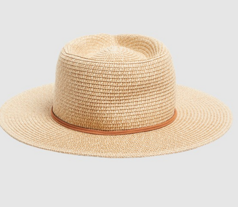 The Miranda Hat is a stylish Panama style hat with faux suede band detail and metal logo badge.