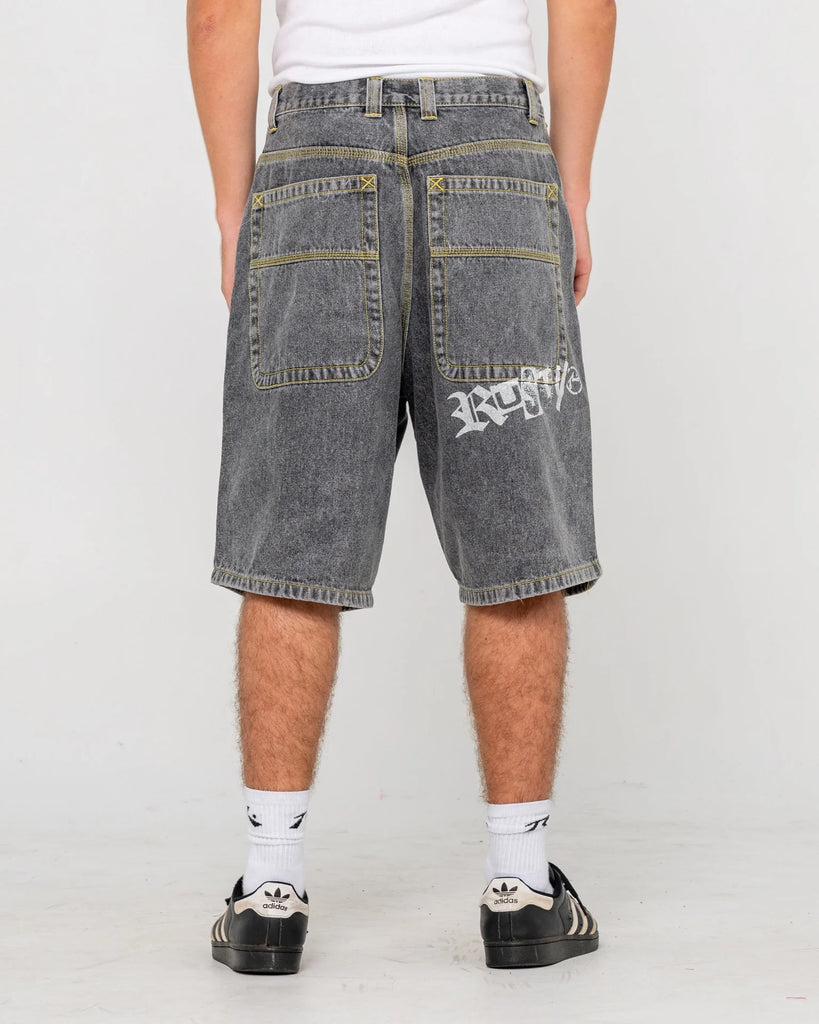 Baggy Fit Jort With Lemon Yellow Topstitch And Rusty Ransom Screen Print. 100% Cotton Indigo Denim