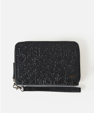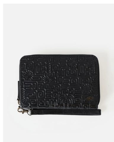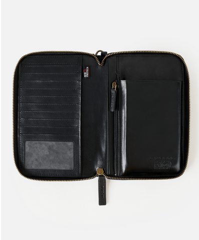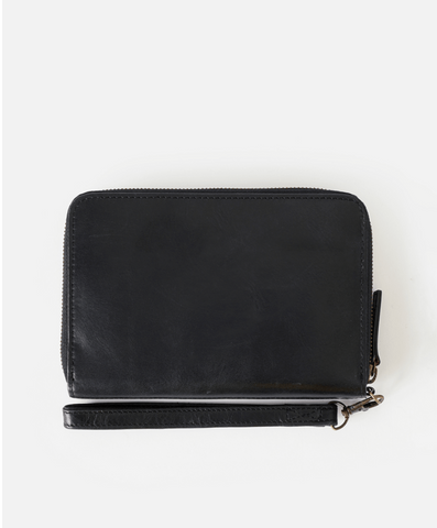 Vegetable-tanned cow leather shapes this large wallet, complete with multiple card slots, a coin compartment, note storage, and RFID protection. The Oversized RFID Leather Wallet also features a detachable wrist strap and embossed front panel for a classic surf finish.