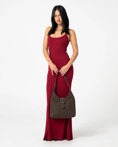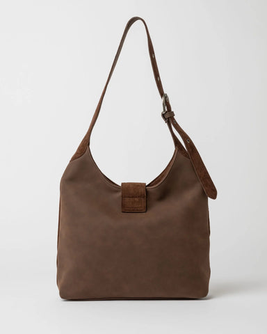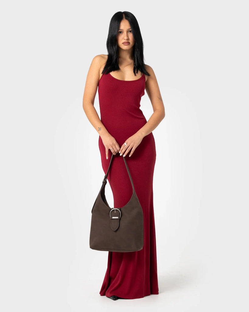 Semi Structured Faux Suede Shoulder Bag With Statement Buckle Hardware And Adjustable Shoulder Strap. 100% PU
