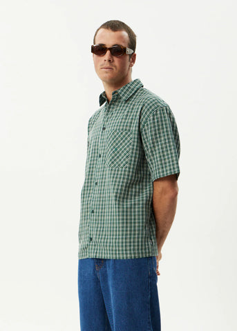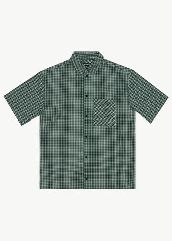 Mens short sleeve shirtBoxy fitCentre button upTraditional collarLeft patch pocket with embroidered flameCustom yarn dyed woven checkLightweight fabric