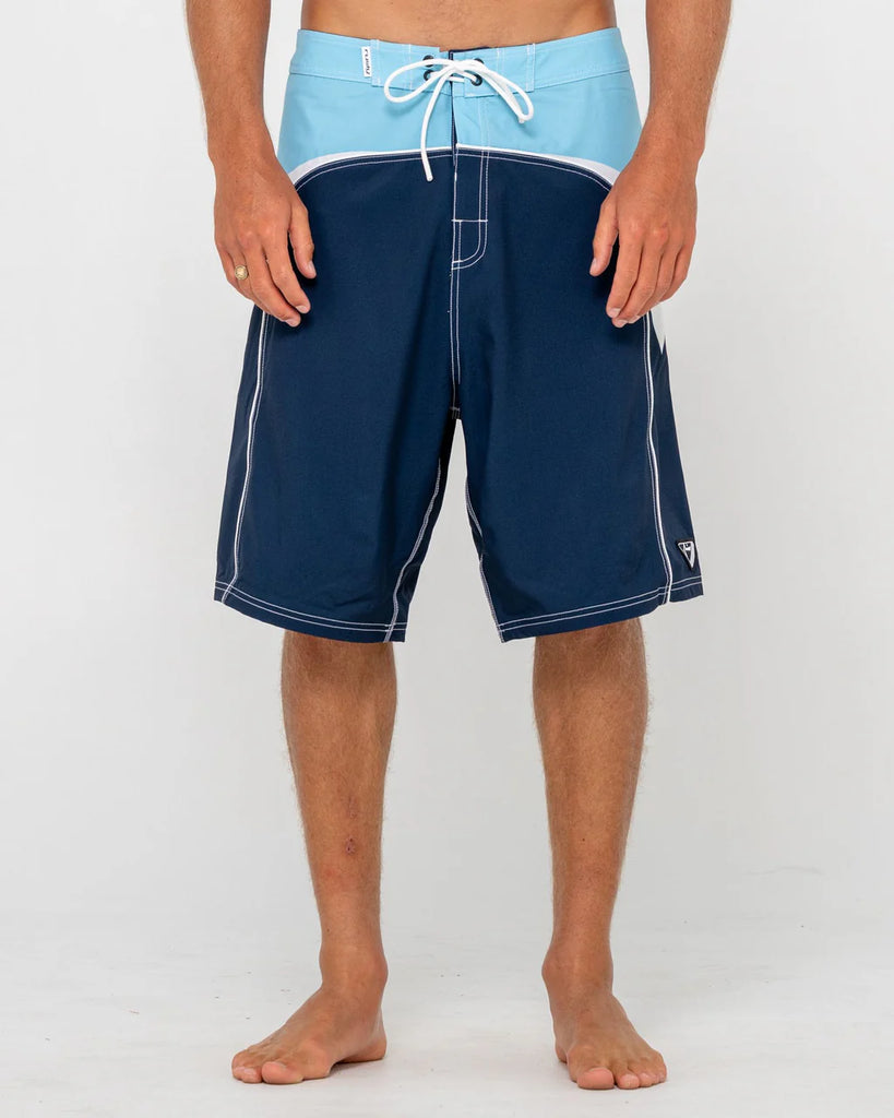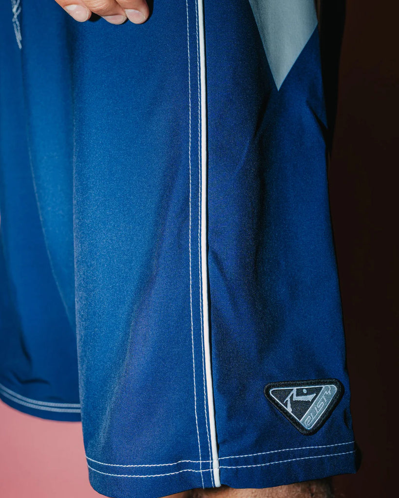 Baggy Fit Fixed Waist Boardshort With Piping Details And A 23" Inch Outseam. 52% Polyester / 38% Recycled Polyester / 10% Spandex 4 Way Stretch